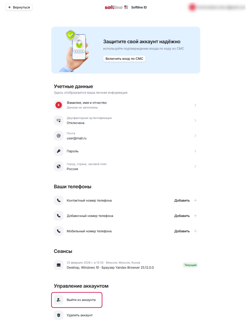 Вы можете выйти из аккаунта в своем профиле или на одном из сайтов Softline, на который вы перешли после авторизации.