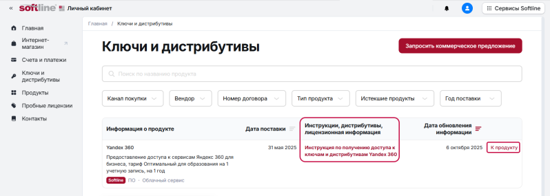 В личном кабинете вы можете получить лицензионную информацию для ваших продуктов (инструкции, ссылки на дистрибутивы, ключи).