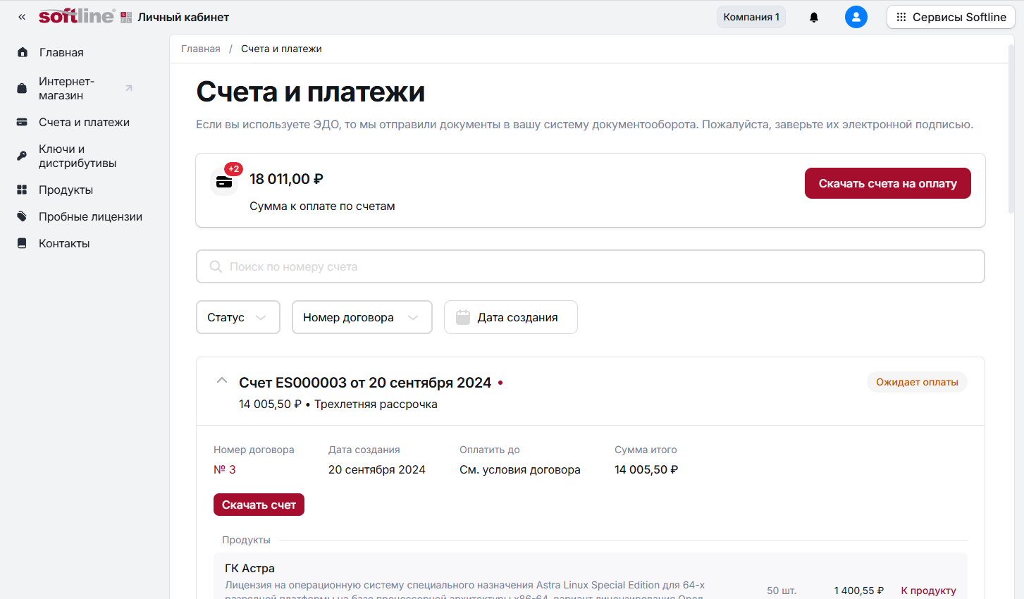 Если счет имеет статус Поставлен, то на странице продукта вы сможете скачать ключи, дистрибутивы, инструкции.