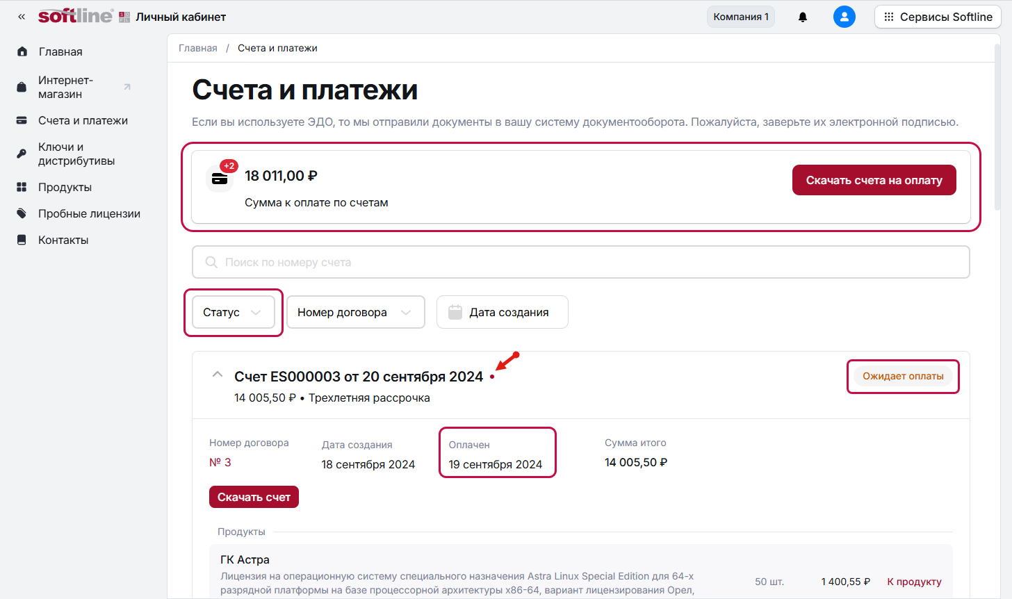 - Посмотреть информацию о счете: номер договора, дату создания счета, условия оплаты (обратите внимание, он может иметь ограниченную дату оплаты), сумму, статусы оплаты / поставки.