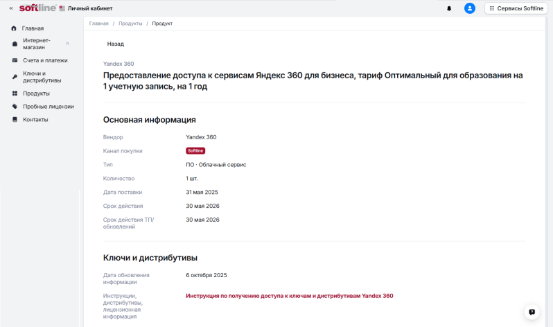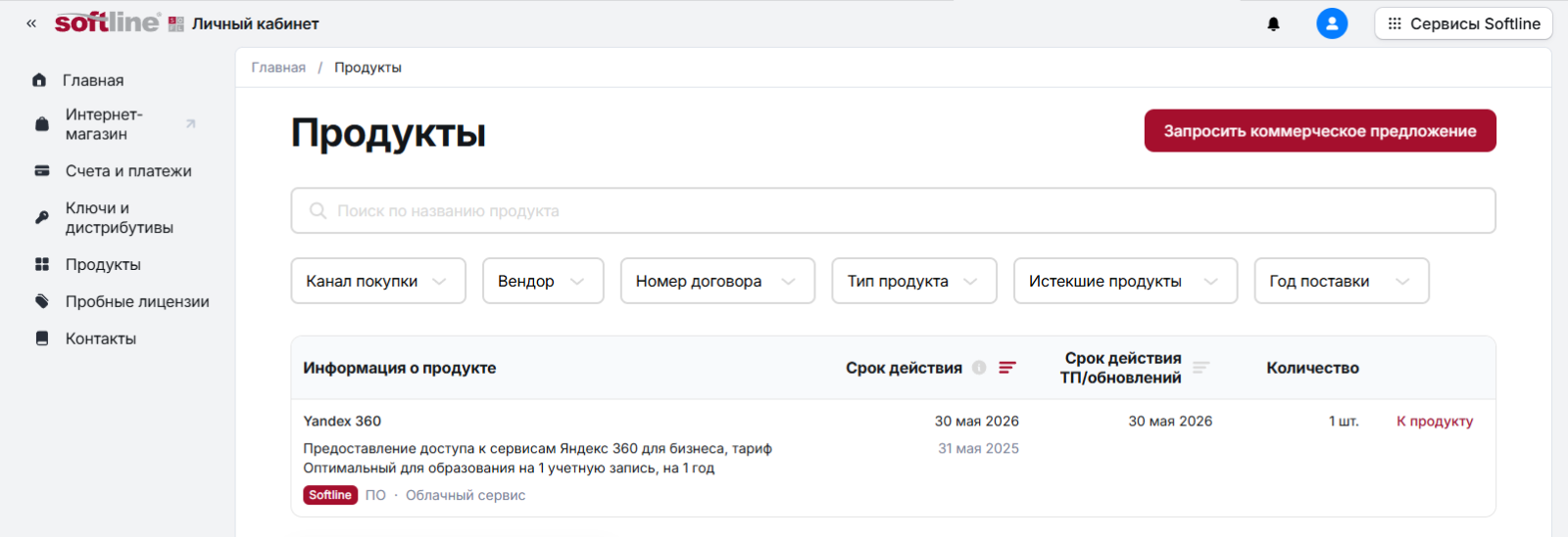 В личном кабинете вы можете посмотреть список приобретенных вами продуктов, контролировать количество, сроки действия лицензий и цены, отправлять заявки на закупку продуктов.