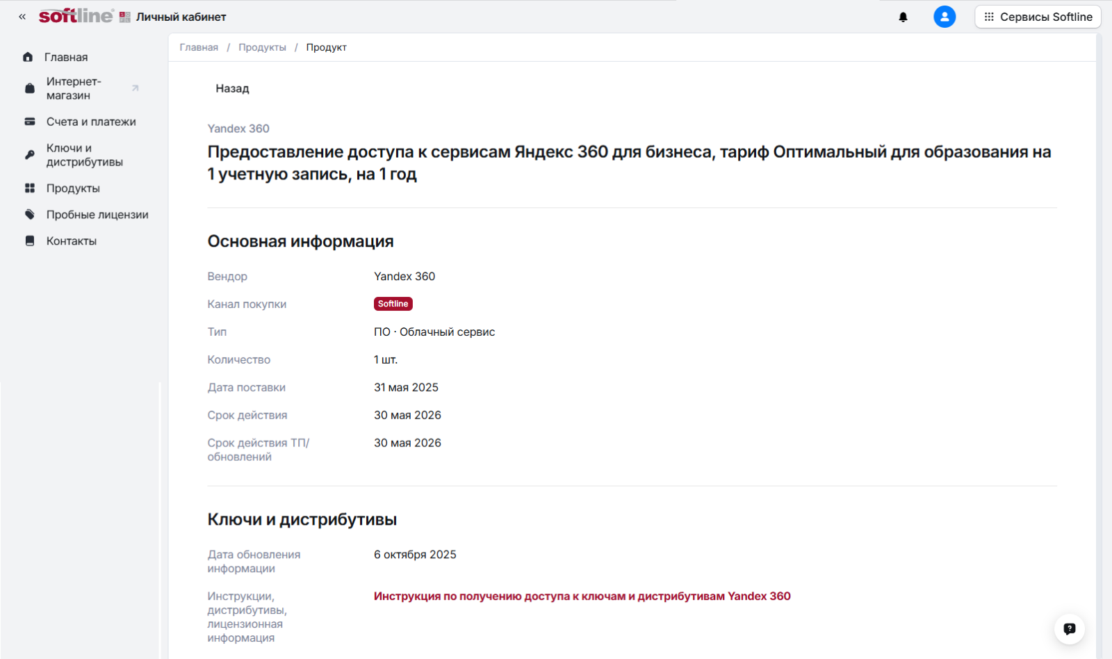 Обратите внимание, при сортировке по сроку действия она осуществляется по началу срока действия. - Нажмите на ссылку К продукту в строке продукта, чтобы перейти на страницу продукта. На ней вы можете получить ключи и дистрибутивы к продукту, если они доступны.