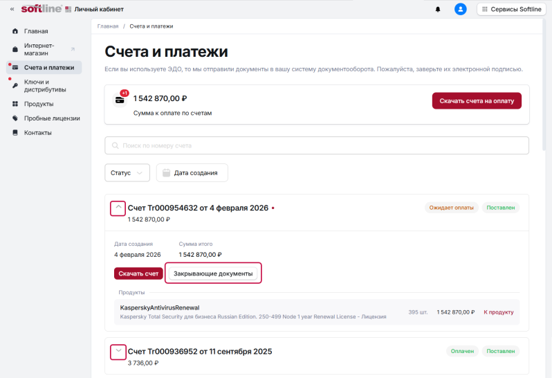В личном кабинете вы можете посмотреть закрывающие документы для ваших счетов.