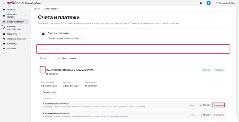 Вы также можете перейти к просмотру лицензионной информации со страницы продукта в разделе Продукты, нажав на ссылку К продукту.