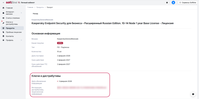 В личном кабинете вы можете получить лицензионную информацию для ваших продуктов (инструкции, ссылки на дистрибутивы, ключи).